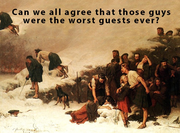 In the Game of Thrones episode entitled “The Red Wedding”, the Stark family and most of their soldiers are slaughtered at the wedding feast of Edmure Tully and Roslin Frey in a total betrayal. R.R. Martin, creator of the show, says that the episode was inspired by the Massacre of Glencoe in 1692, during which soldiers led by Captain Robert Campbell asked the MacDonalds for shelter for him and his men due to a full nearby fort. The MacDonalds obliged, having them for nearly two weeks before being slaughtered. The soldiers said goodnight to the MacDonalds after playing cards and then slaughtered as many as they could. It was said to be especially barbarous because it was a “Slaughter under trust”
